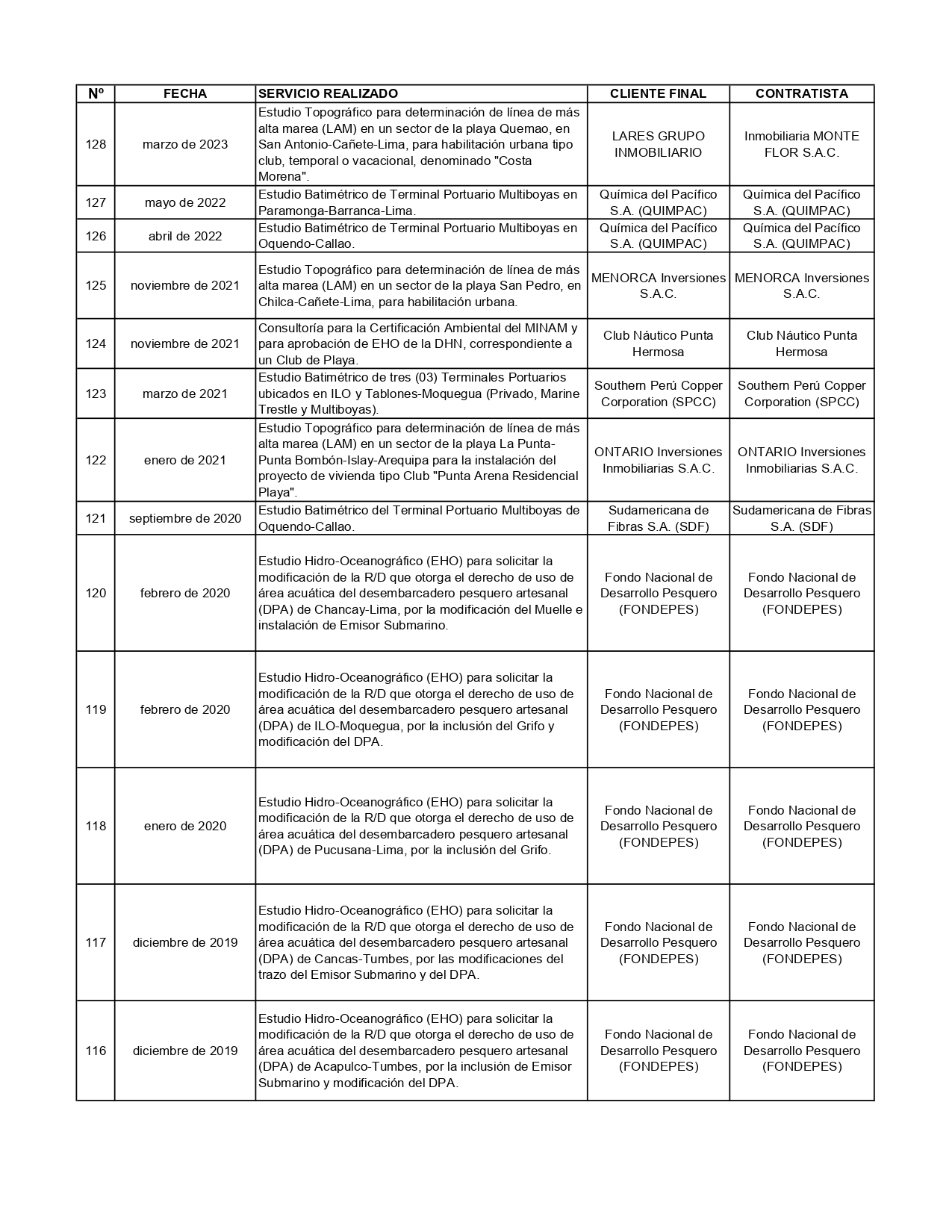 Realizamos servicios o estudios hidro-oceanográficos, cuyos componentes principales son los levantamientos batimétricos, levantamientos topográficos, geodesia, estudio de olas, estudio de corrientes, estudio de mareas, estudio de vientos, geomorfología de la costa, muestreo del material…